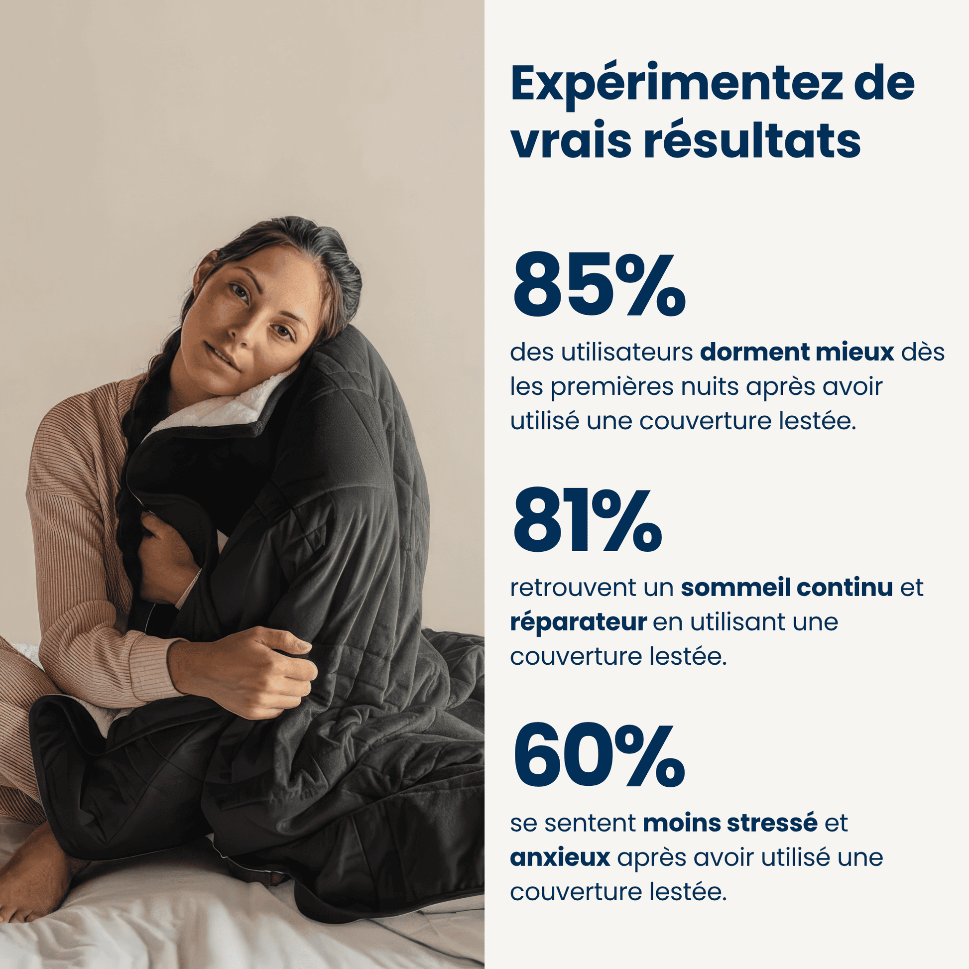La couverture lestée est utilisée depuis + 20 ans en thérapie du sommeil. Le principe de Stimulation par Pression Profonde (DPS) est scientifiquement validé : 81% de nos clients constatent une amélioration dès la première semaine. Et vous avez 100 nuits pour tester sans risque, satisfait ou 100% remboursé.