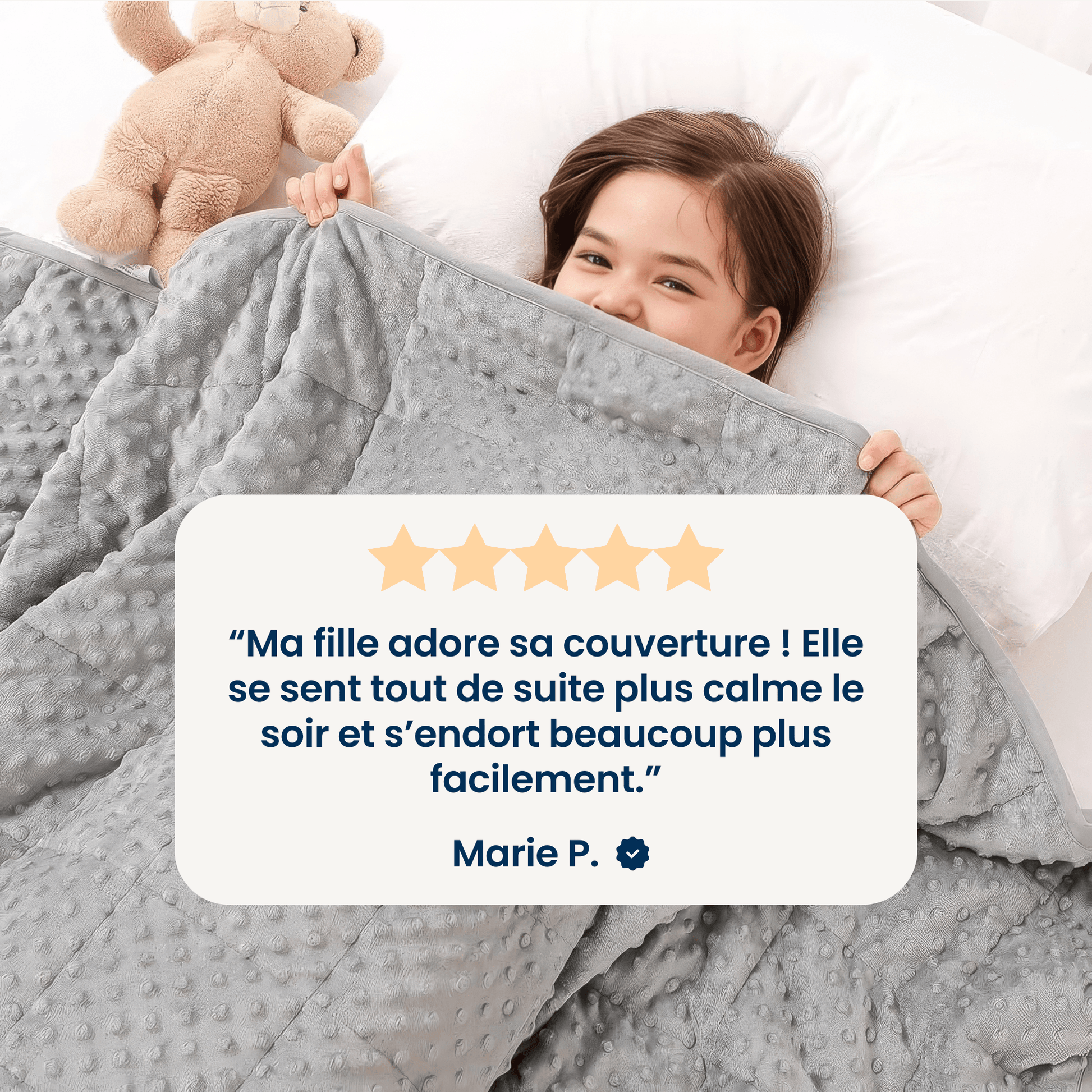 Conçue pour accompagner les enfants qui ont du mal à se calmer au moment du coucher, cette couverture convient particulièrement aux petits anxieux, hypersensibles, TDAH ou TSA. Sa pression douce reproduit une sensation d’enveloppement rassurant, aidant votre enfant à réguler son agitation, à apaiser son stress et à trouver un sommeil plus stable et plus profond.
