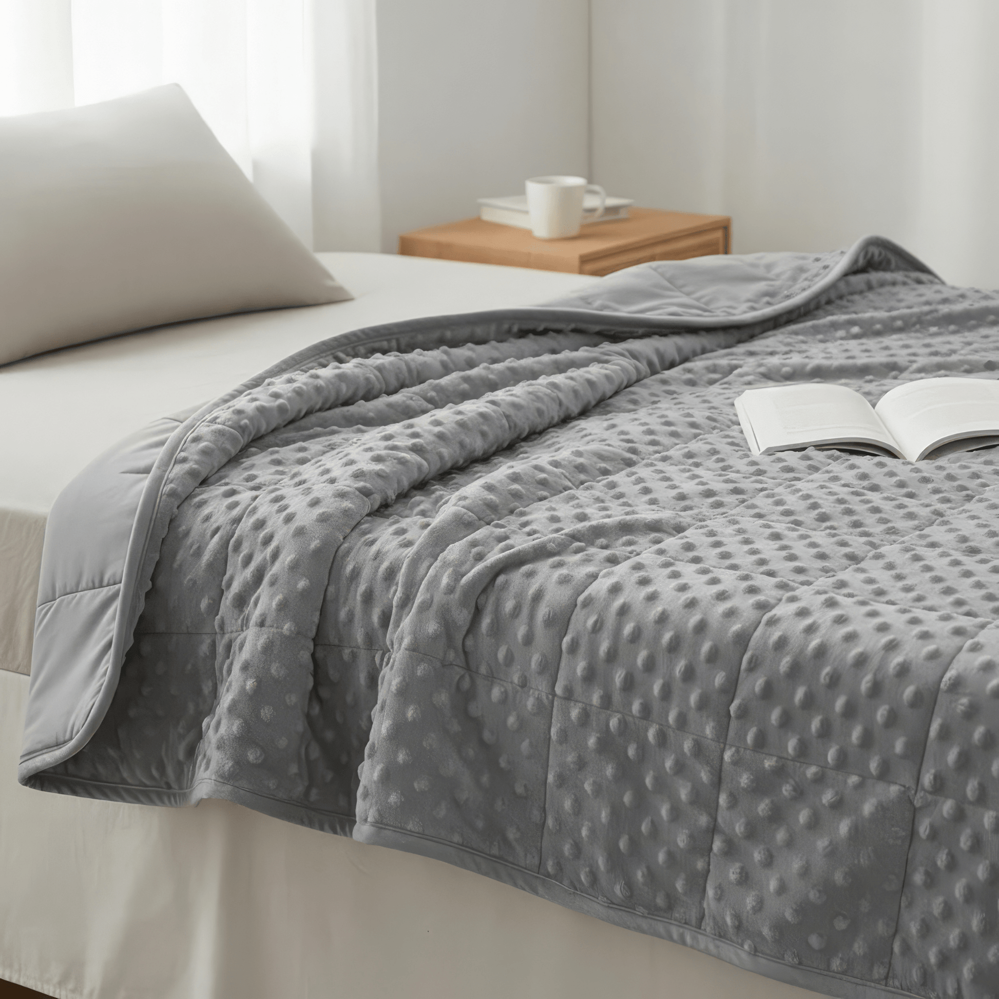 Notre couverture applique une pression uniforme équivalente à 10% de votre poids corporel. Cette technique thérapeutique, utilisée depuis 20 ans en clinique, stimule naturellement la production de sérotonine et mélatonine tout en réduisant le cortisol (hormone du stress).
