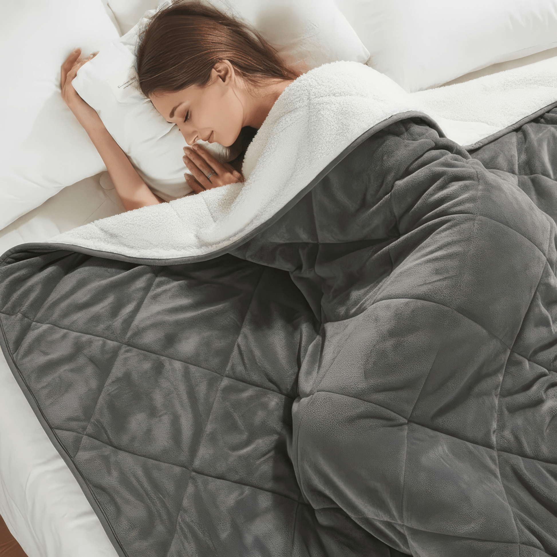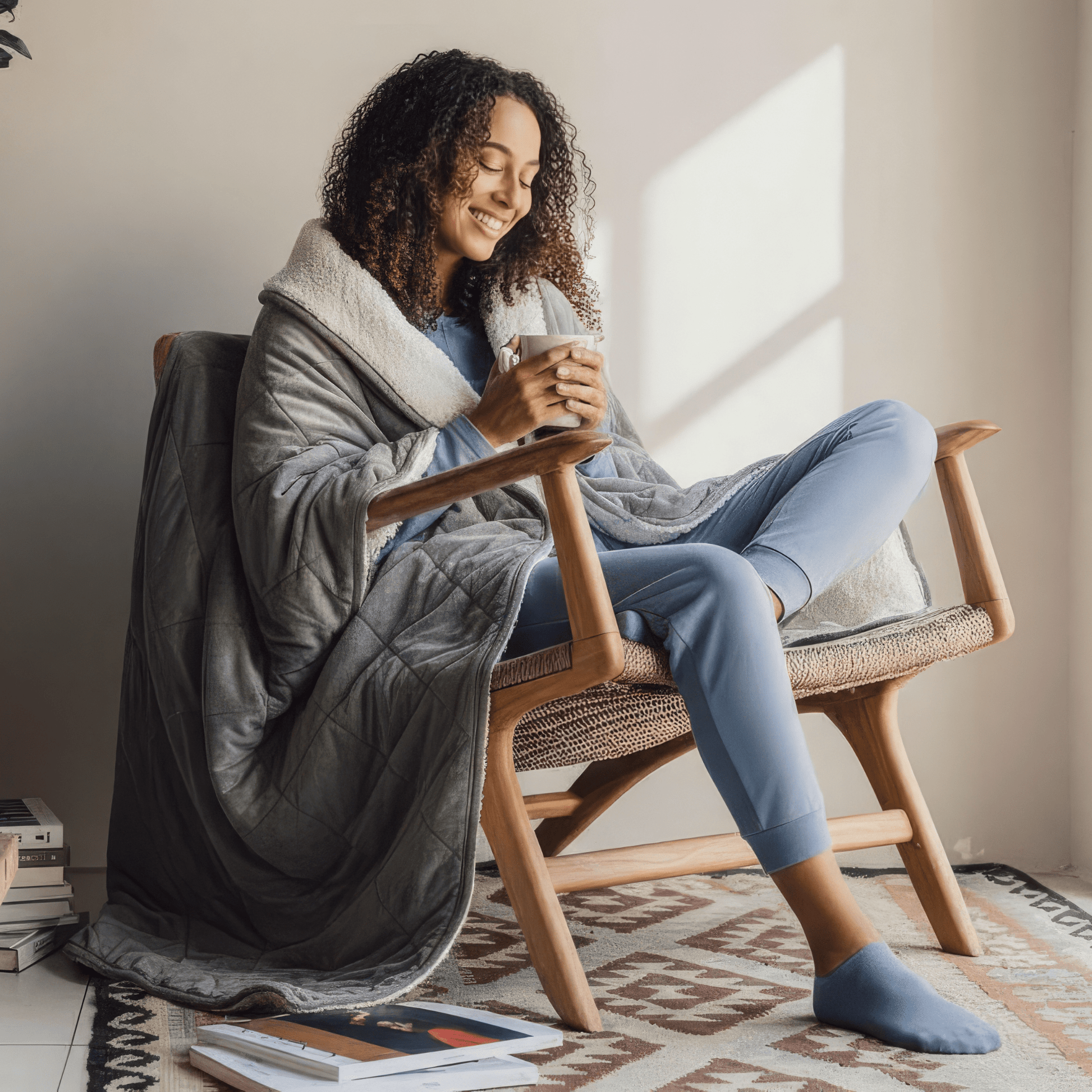 Notre couverture applique une pression uniforme équivalente à 10% de votre poids corporel. Cette technique thérapeutique, utilisée depuis 20 ans en clinique, stimule naturellement la production de sérotonine et mélatonine tout en réduisant le cortisol (hormone du stress).