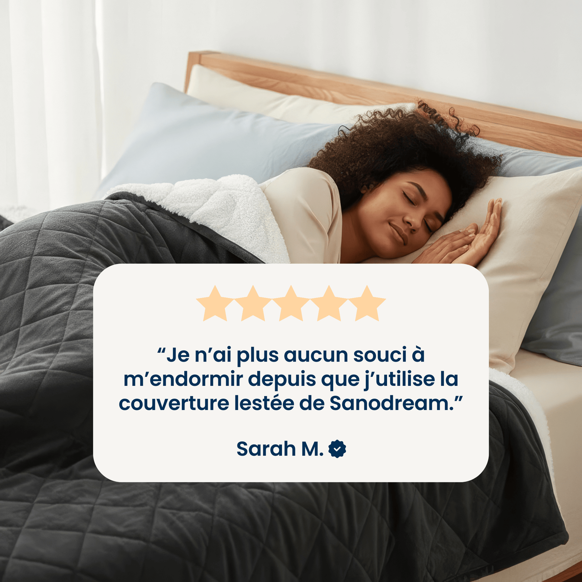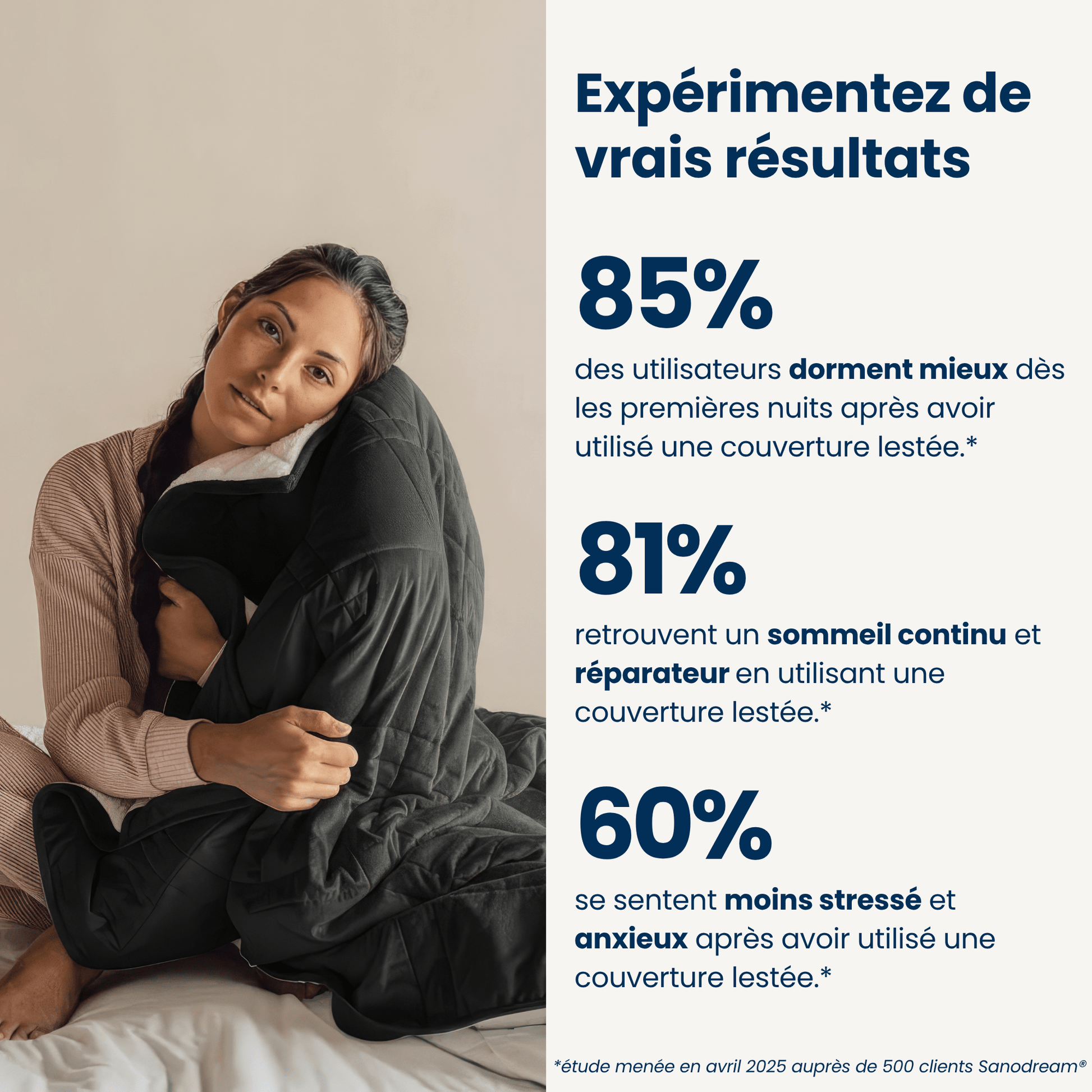 La couverture lestée est utilisée depuis + 20 ans en thérapie du sommeil. Le principe de Stimulation par Pression Profonde (DPS) est scientifiquement validé : 81% de nos clients constatent une amélioration dès la première semaine. Et vous avez 30 nuits pour tester sans risque, satisfait ou 100% remboursé.